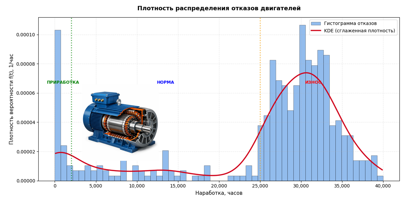 Для примера на рисунке приведена гистограмма отказов парка асинхронных двигателей. По оси абсцисс отложено условное время наработки двигателя, которое рассчитывается как реальное время работы двигателя умноженное на коэффициенты, учитывающие режим работы двигателя и изменяющиеся условия его эксплуатации.